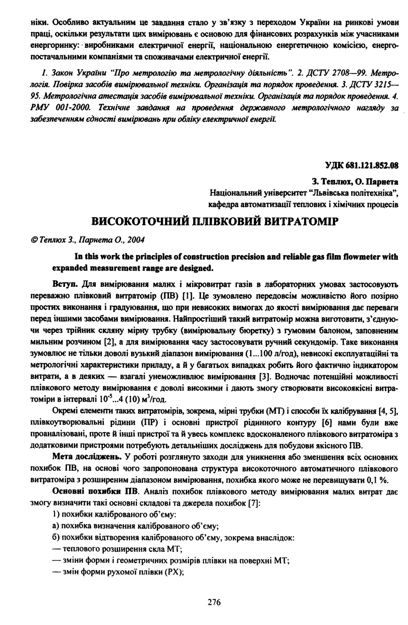 Теплюх З. Високоточний плівковий витратомір / З. Теплюх, О. Парнета // Вісник Національного університету “Львівська політехніка”. — Львів : Видавництво Національного університету “Львівська політехніка”, 2004. — № 506 : Теплоенергетика. Інженерія довкілля. Автоматизація. — С. 276–282.
