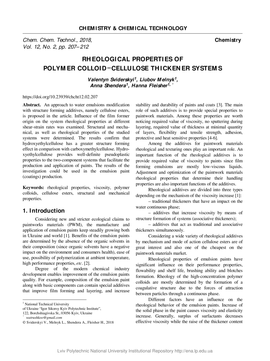 Rheological properties of polymer colloid–cellulose thickener systems / Valentyn Sviderskyi, Liubov Melnyk, Anna Shendera, Hanna Fleisher // Chemistry & Chemical Technology. — Lviv : Lviv Politechnic Publishing House, 2018. — Vol 12. — No 2. — P. 207–212.