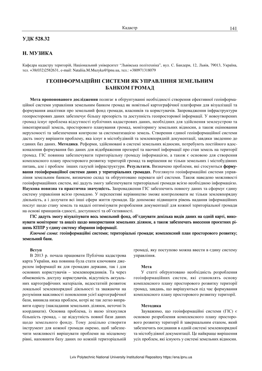 | dc.description.abstract | Мета пропонованого дослідження полягає в обґрунтуванні необхідності створення ефективної геоінформаційної системи управління земельним банком громад як новітньої картографічної платформи для візуалізації та формування аналітики про земельний фонд громади, власників та користувачів. Запровадження інфраструктури геопросторових даних забезпечує більшу прозорість та доступність геопросторової інформації. У новоутворених громад існує проблема відсутності публічних кадастрових даних, необхідних для здійснення землеустрою та інвентаризації земель, просторового планування громад, моніторингу земельних відносин, а також оцінювання нерухомості та забезпечення контролю за систематизацією земель. Створення єдиної геоінформаційної системи дасть змогу вирішити проблему, яка існує в містобудівній та землевпорядній документації, завдяки зведенню до єдиних баз даних. Методика. Реформи, здійснювані в системі земельних відносин, потребують постійного вдосконалення формування баз даних для відображення прозорої та наочної інформації про стан земель на території громад. ГІС повинна забезпечувати територіальну громаду інформацією, а також є основою для створення комплексного плану просторового розвитку територій громад та вирішення не тільки земельних і містобудівних питань, але і проблем інших галузей інфраструктури. Результати. Визначено проблеми, які стосуються формування геоінформаційної системи даних у територіальних громадах. Розглянуто геоінформаційні системи управління земельним банком, визначено склад та обґрунтовано переваги цієї системи. Також наведено можливості геоінформаційних систем, які дадуть змогу забезпечувати територіальні громади всією необхідною інформацією. Наукова новизна та практична значущість. Запровадження ГІС забезпечить повноту даних та сформує єдину систему управління всією громадою. У перспективі керівництво зможе контролювати не тільки землевпорядну діяльність, а і долучати всі інші сфери життя громади. Це допоможе підвищити рівень надання інформаційних послуг щодо стану земель та надалі оптимізувати розроблення документації для кожної територіальної громади на основі принципів єдності, доступності та об’єктивності. ГІС дадуть змогу візуалізувати весь земельний фонд, об’єднувати декілька видів даних на одній карті, виконувати моніторинг та аналіз щодо використання земельних ділянок, а також забезпечать внесення проєктних рішень КППР у єдину систему збирання інформації. | |