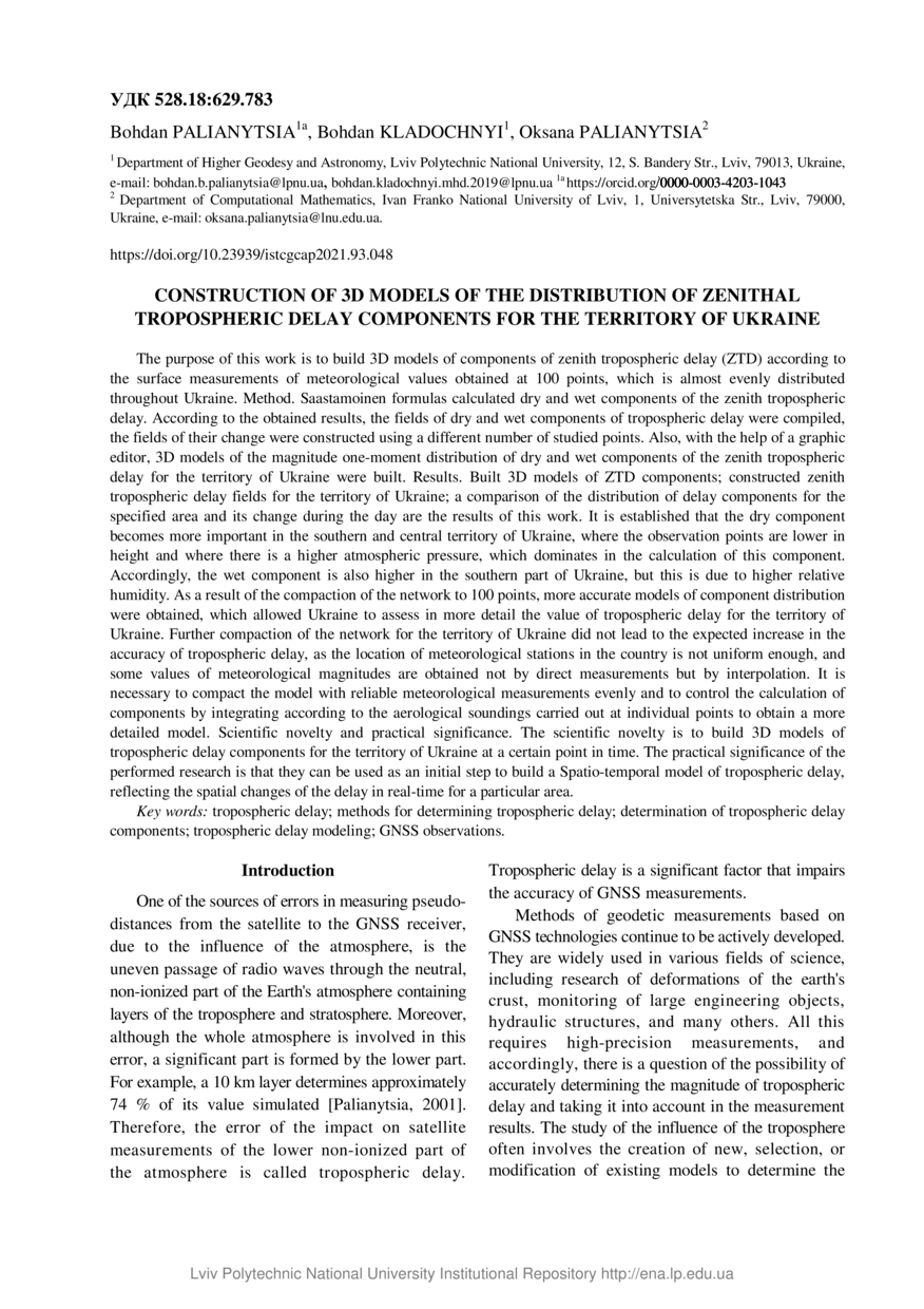 Palianytsia B. Construction of 3d models of the distribution of zenithal tropospheric delay components for the territory of Ukraine / Bohdan Palianytsia, Bohdan Kladochnyi, Oksana Palianytsia // Geodesy, cartography and aerial photography. — Lviv : Lviv Politechnic Publishing House, 2021. — No 93. — P. 48–58.