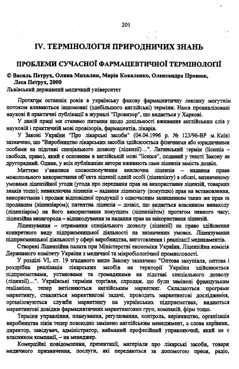 Проблеми сучасної фармацевтичної термінології / В. Петрух, О. Михалик, М. Коваленко, О. Пронюк, Л. Петрух // Вісник Державного університету “Львівська політехніка”. — Львів : Видавництво Державного університету “Львівська політехніка”, 2000. — № 402 : Проблеми української термінології. — С. 201–202. — (Термінологія природничих знань).