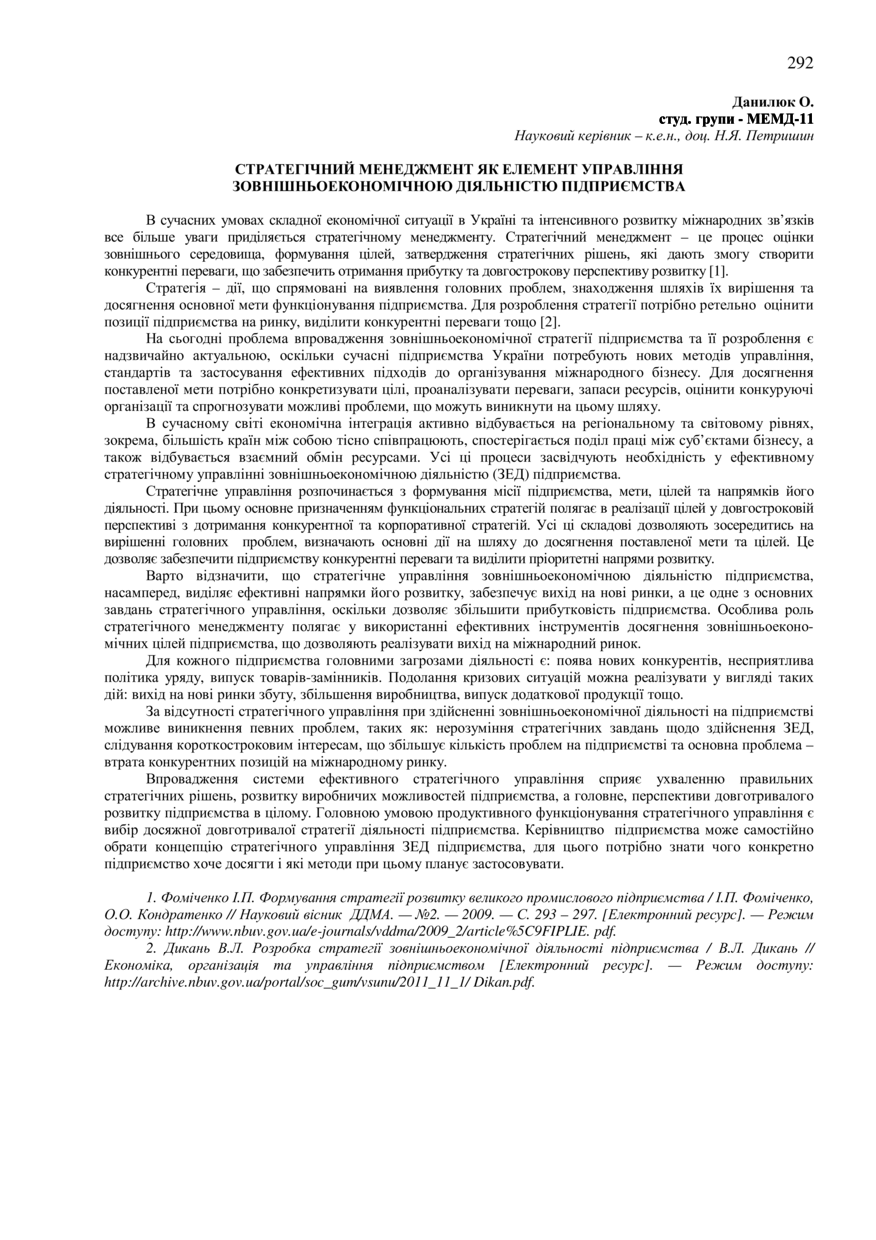| dc.relation.referencesen | 2. Dykan V.L. Rozrobka stratehii zovnishnoekonomichnoi diialnosti pidpryiemstva, V.L. Dykan, Ekonomika, orhanizatsiia ta upravlinnia pidpryiemstvom [Electronic resource], Access mode: http://archive.nbuv.gov.ua/portal/soc_gum/vsunu/2011_11_1/ Dikan.pdf. | |