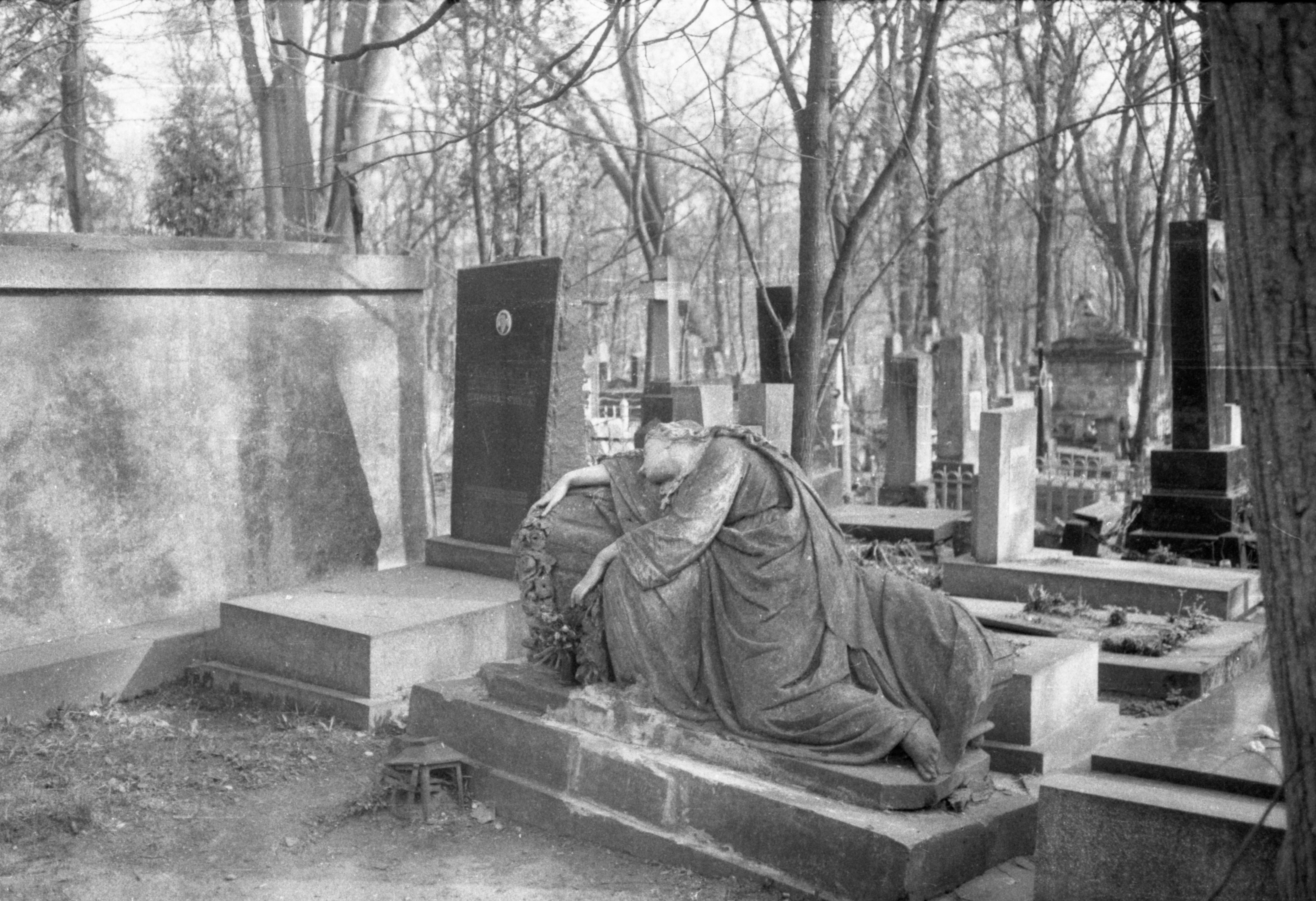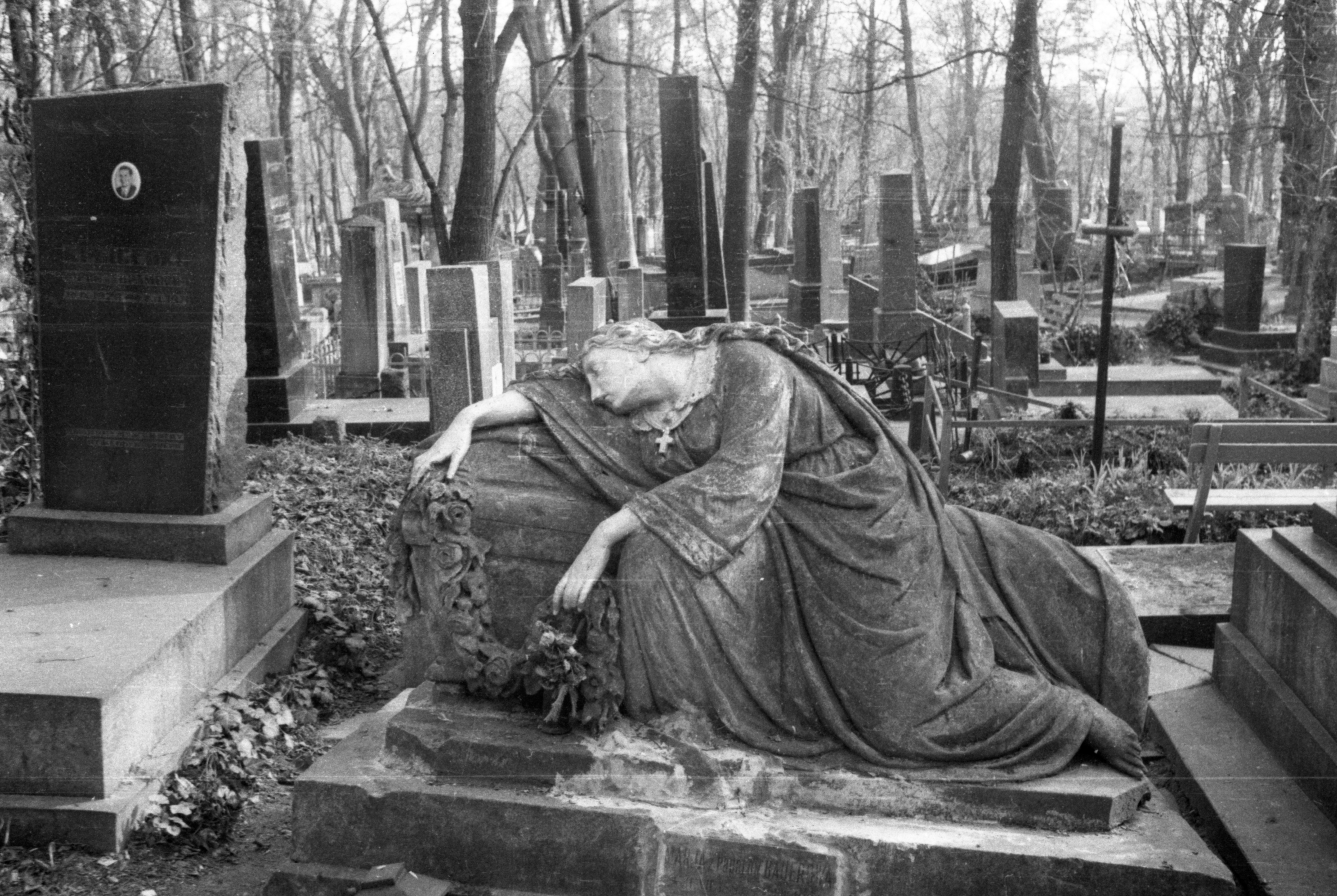 Надгробок — скульптура жінки з гірляндою квітів у руках, яка схилилась в жалобі на труну.