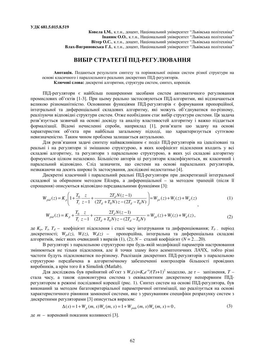 Вибір стратегії ПІД-регулювання / І. М. Ковела, О. О. Іванюк, О. С. Вітер, Г. І. Влах-Вигриновська // Автоматика/Automatiсs – 2018 : матеріали XXV Міжнародної конференція з автоматичного управління, 18–19 вересня 2018 року, Львів. — Львів : Видавництво Львівської політехніки, 2018. — С. 62–63. — (Керування технічними, технолоічними, біотетехнічними об’єктами).