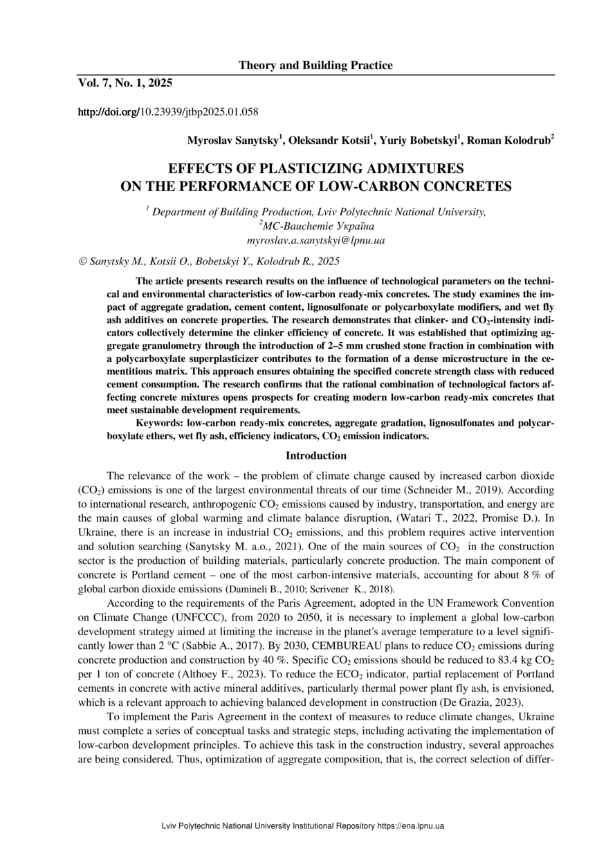 Effects of plasticizing admixtures on the performance of low-carbon concretes / Myroslav Sanytsky, Oleksandr Kotsii, Yuriy Bobetskyi, Roman Kolodrub // Theory and Building Practice. — Lviv : Lviv Politechnic Publishing House, 2025. — Vol 7. — No 1. — P. 58–64.