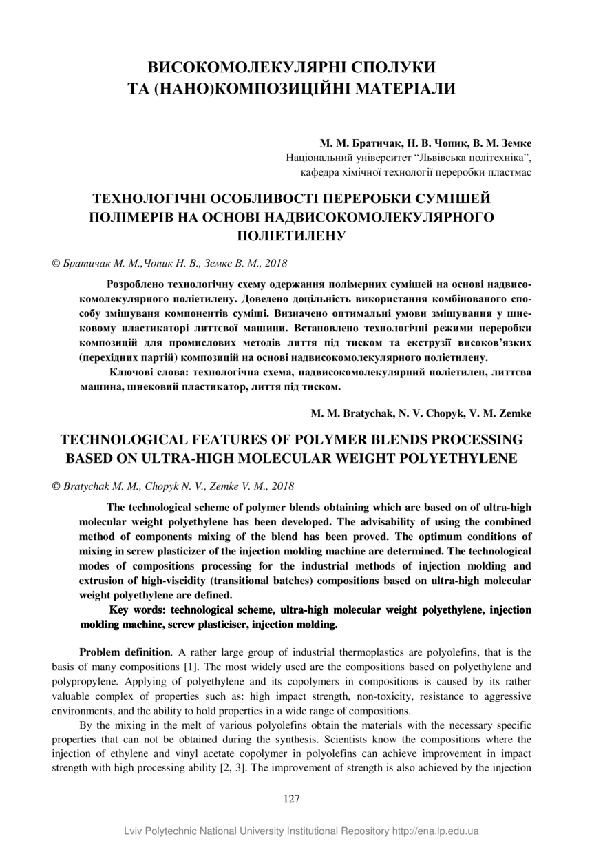 Bratychak M. M. Technological features of polymer blends processing on the basis of ultra-high molecular weight polyethylene / M. M. Bratychak, N. V. Chopyk, V. M. Zemke // Chemistry, Technology and Application of Substance. — Lviv : Lviv Politechnic Publishing House, 2018. — Vol 1. — No 1. — P. 127–132.