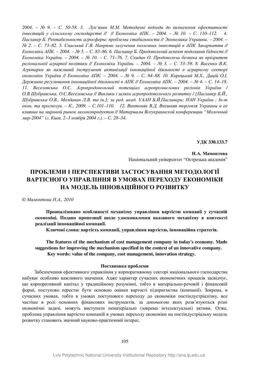 Мамонтова Н. А. Проблеми і перспективи застосування методології вартісного управління в умовах переходу економіки на модель інноваційного розвитку / Н. А. Мамонтова // Вісник Національного університету “Львівська політехніка”. — Львів : Видавництво Львівської політехніки, 2010. — № 668 : Проблеми економіки та управління. — С. 105–110.