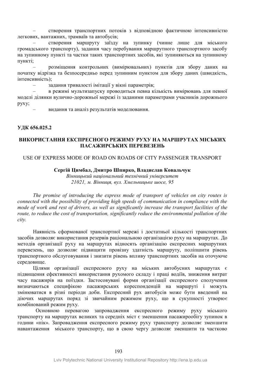 Цимбал С. Використання експресного режиму руху на маршрутах міських пасажирських перевезень / Сергій Цимбал, Дмитро Шпирко, Владислав Ковальчук // Автобусобудування та пасажирські перевезення в Україні : тези доповідей III-ої Всеукраїнської науково-практичної конференції, Львів, 22-23 лютого 2018 року. — Львів : Видавництво Львівської політехніки, 2018. — С. 193–195. — (Інновації в перевезеннях колісним транспортом).