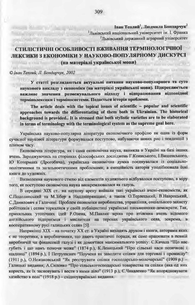 Теплий І. Стилістичні особливості вживання термінологічної лексики з економіки у науково-популярному дискурсі (на матеріалі української мови) / Іван Теплий, Людмила Бондарчук // Вісник Національного університету “Львівська політехніка”. — Львів : Видавництво Національного університету “Львівська політехніка”, 2002. — № 453 : Проблеми української термінології. — С. 309–313. — (Термінологія природничих знань).