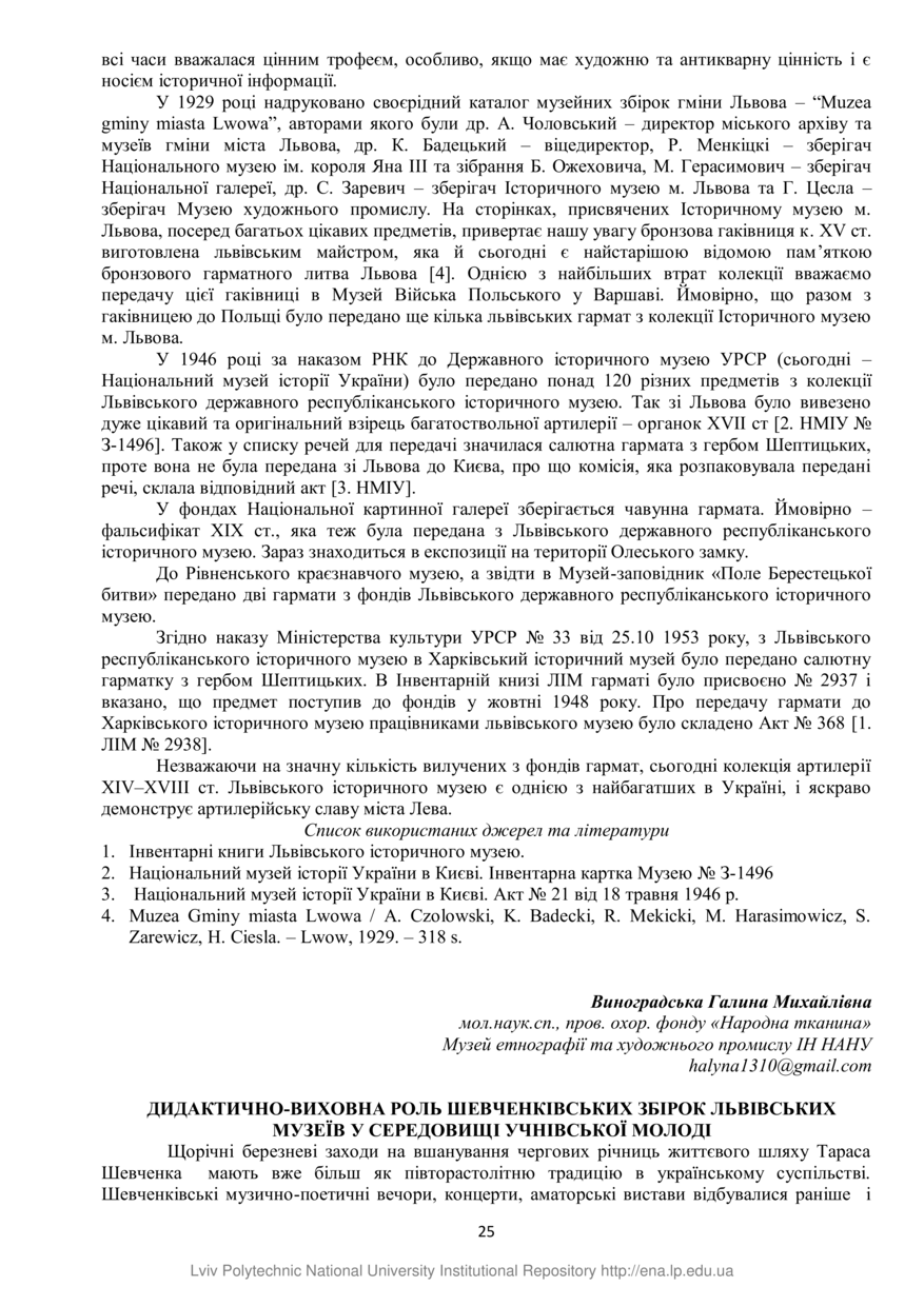 Виноградська Г. М. Дидактично-виховна роль Шевченківських збірок львівських музеїв у середовищі учнівської молоді / Галина Михайлівна Виноградська // Історико-культурна спадщина: проблеми збереження і популяризаці : тези IV Міжнародної науково-практичної конференції, 21-22 квітня 2017 року. — Львів, 2017. — С. 25–28.