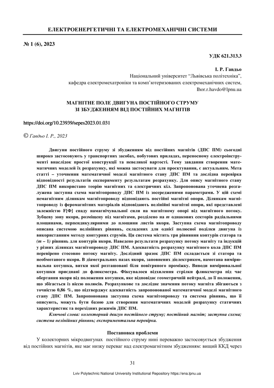 Гавдьо І. Магнітне поле двигуна постійного струму зі збудженням від постійних магнітів / Ігор Гавдьо // Електроенергетичні та електромеханічні системи. — Львів : Видавництво Львівської політехніки, 2023. — Том 6. — № 1. — С. 31–37.