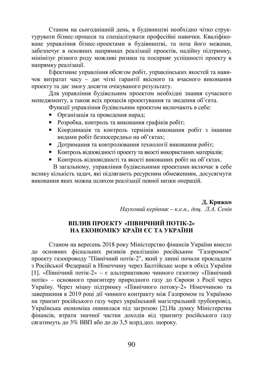 Крижко Д. Вплив проекту «Північний потік-2» на економіку країн ЄС та України / Д. Крижко, Л. А. Сенів // 76-та Студентська науково-технічна конференція. Секція "Публічне управління та адміністрування" : збірник тез доповідей, 7 листопада 2018 року, Львів. — Львів : Видавництво Львівської політехніки, 2018. — С. 90–92.