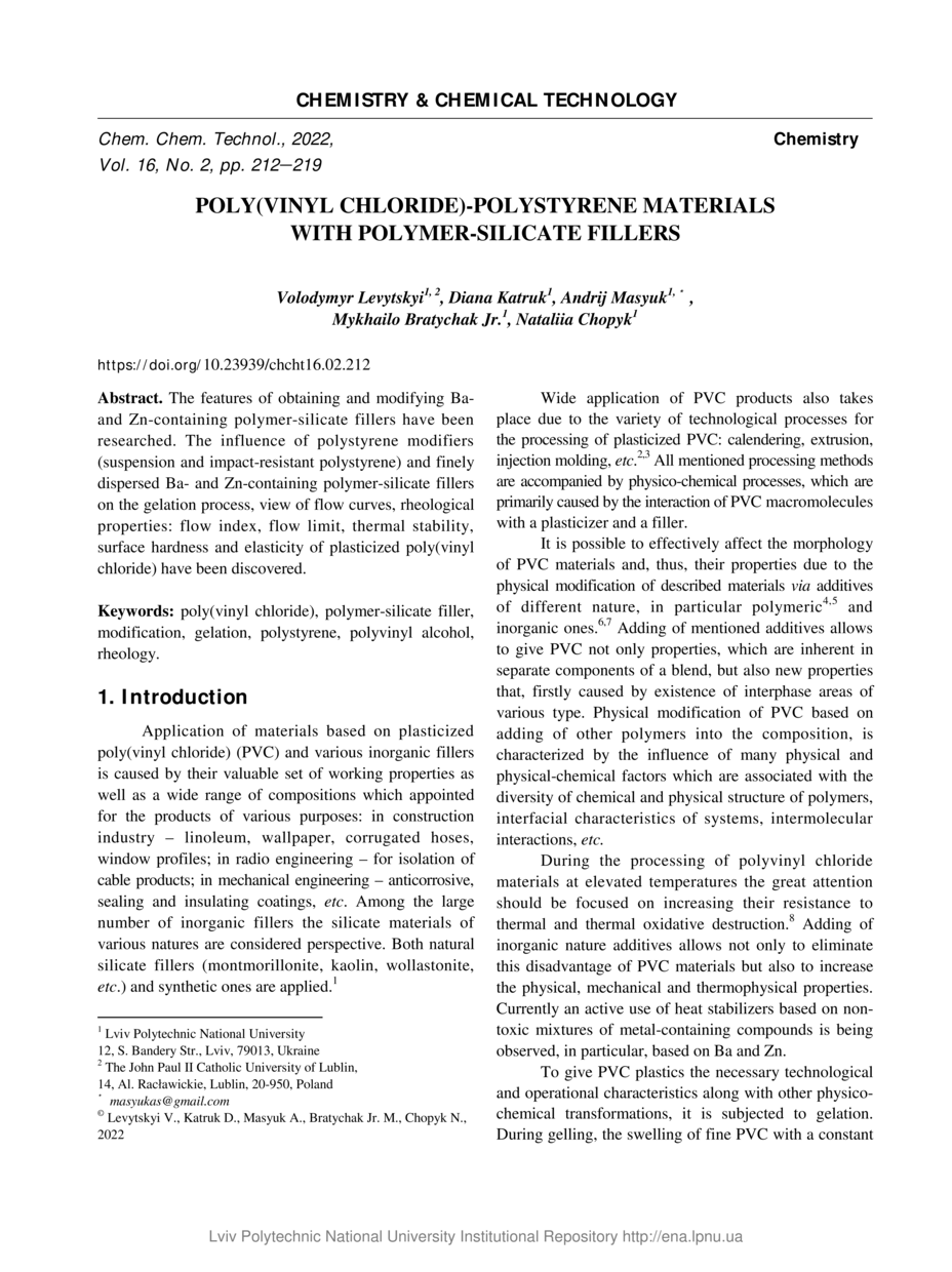 Poly(Vinyl Chloride)-Polystyrene Materials with Polymer-Silicate Fillers / Volodymyr Levytskyi, Diana Katruk, Andrij Masyuk, Mykhailo Bratychak Jr., Nataliia Chopyk // Chemistry & Chemical Technology. — Lviv : Lviv Politechnic Publishing House, 2022. — Vol 16. — No 2. — P. 212–219.