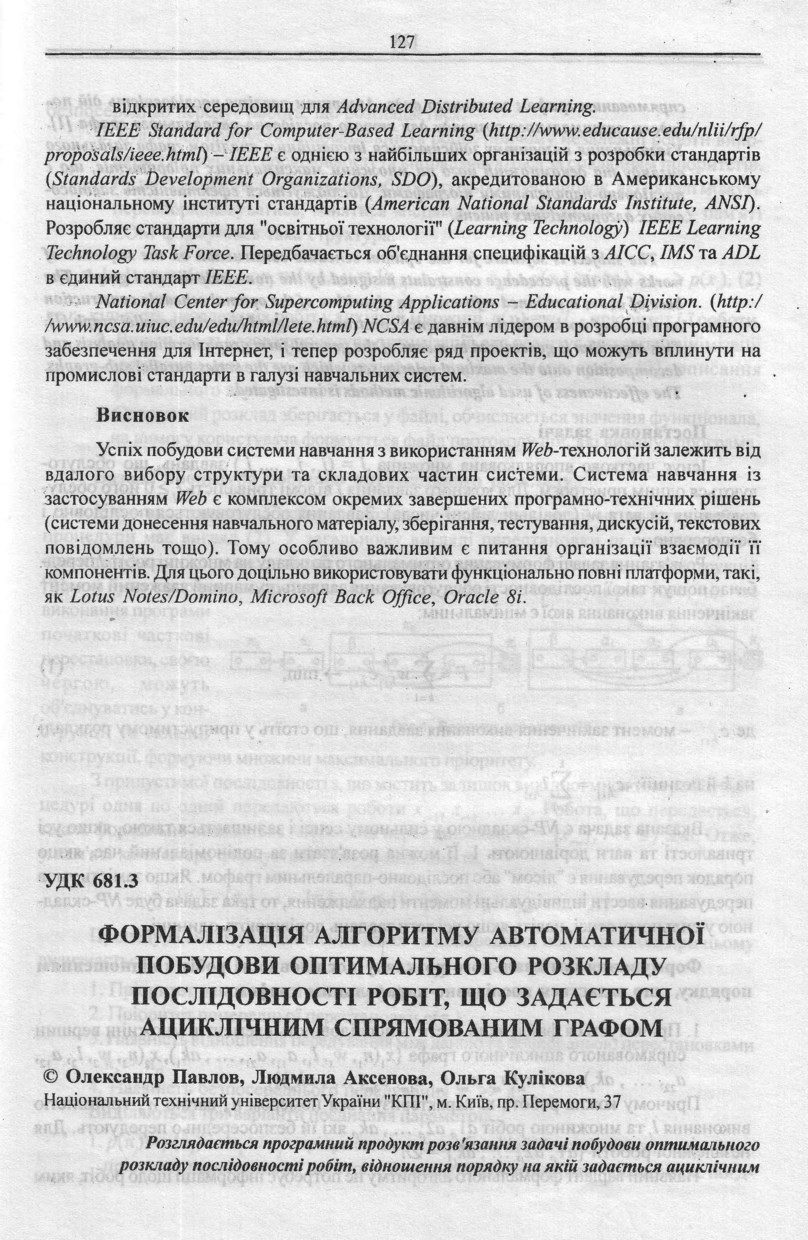 Павлов О. Формалізація алгоритму автоматичної побудови оптимального розкладу послідовності робіт, що задається ациклічним спрямованим графом / О. Павлов, Л. Аксенова, О. Кулікова // Вісник Національного університету “Львівська політехніка”. — Львів : Видавництво Національного університету “Львівська політехніка”, 2000. — № 413 : Комп’ютерна інженерія та інформаційні технології. — С. 127–133. — (Методи й алгоритми сучасних інформаційних технологій).