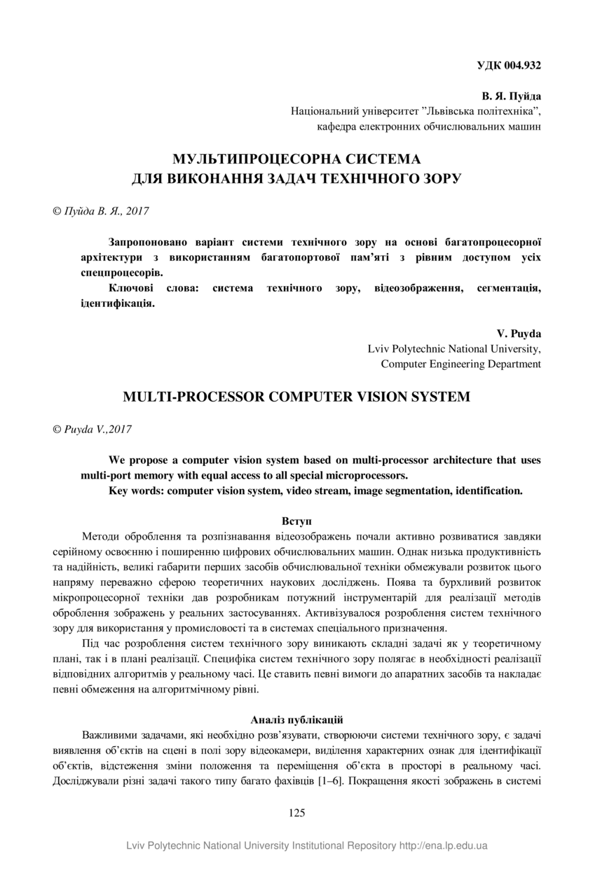 Пуйда В. Я. Мультипроцесорна система для виконання задач технічного зору / В. Я. Пуйда // Вісник Національного університету «Львівська політехніка». Серія: Комп’ютерні системи та мережі. — Львів : Видавництво Львівської політехніки, 2017. — № 881. — С. 125–128.
