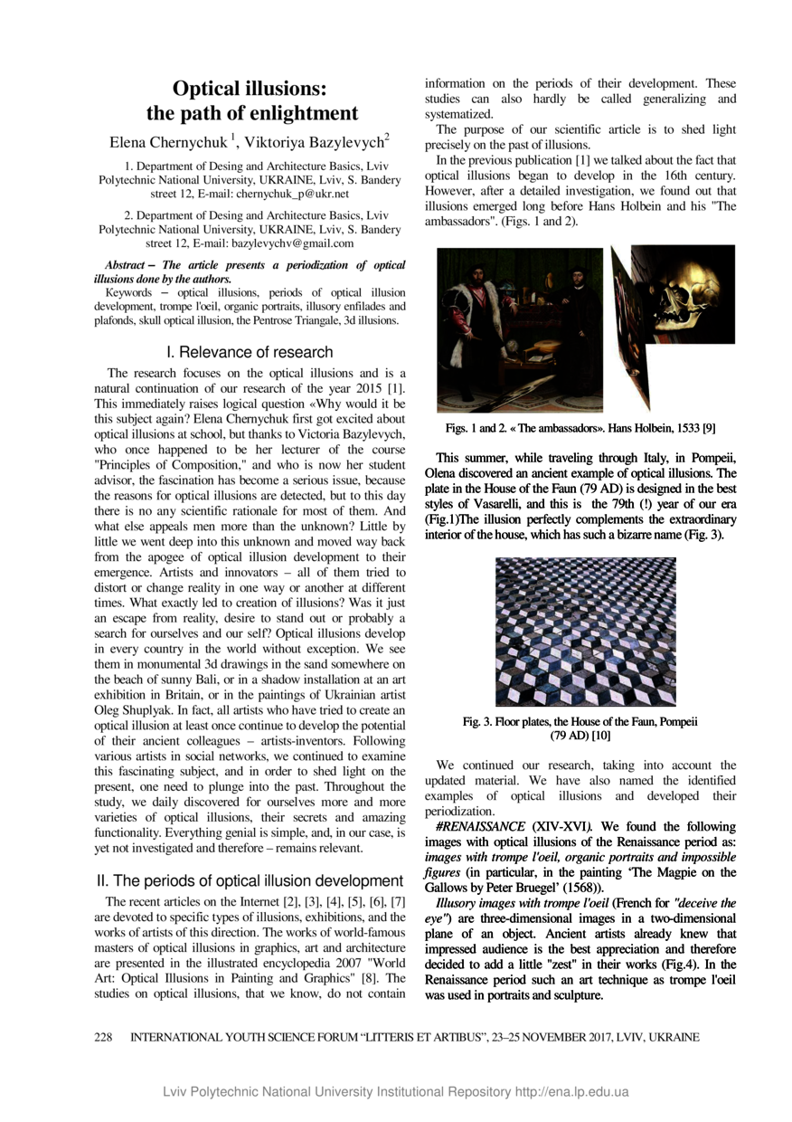Chernychuk E. Optical illusions: the path of enlightment / Elena Chernychuk, Viktoriya Bazylevych // Litteris et Artibus : proceedings, 23–25 November, 2017. — Lviv : Lviv Polytechnic Publishing House, 2017. — P. 228–231. — (8th International academic conference «Geodesy, architecture & construction 2017» (GAC-2017)).