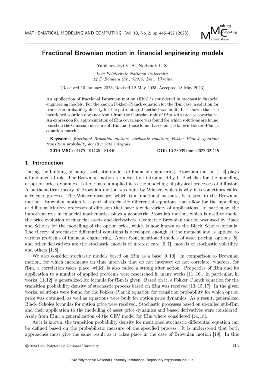 | dc.identifier.citation | Yanishevskyi V. S. Fractional Brownian motion in financial engineering models / V. S. Yanishevskyi, L. S. Nodzhak // Mathematical Modeling and Computing. — Lviv : Lviv Politechnic Publishing House, 2023. — Vol 10. — No 2. — P. 445–457. | |
