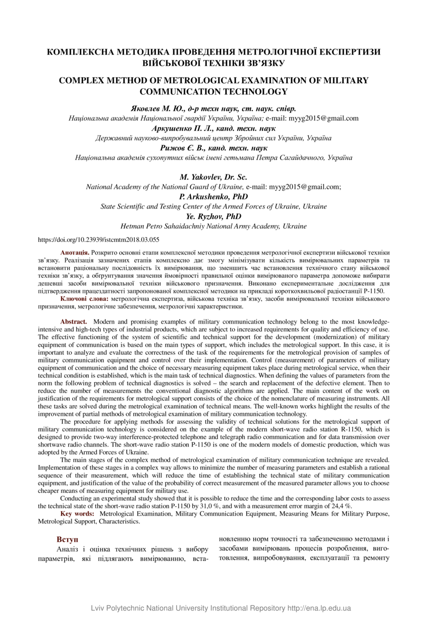 | dc.identifier.citation | Яковлев М. Ю. Комплексна методика проведення метрологічної експертизи військової техніки зв’язку / М. Ю. Яковлев, П. Л. Аркушенко, Є. В. Рижов // Вимірювальна техніка та метрологія : міжвідомчий науково-технічний збірник. — Львів : Видавництво Львівської політехніки, 2018. — Том 79. — № 3. — С. 55–63. | |