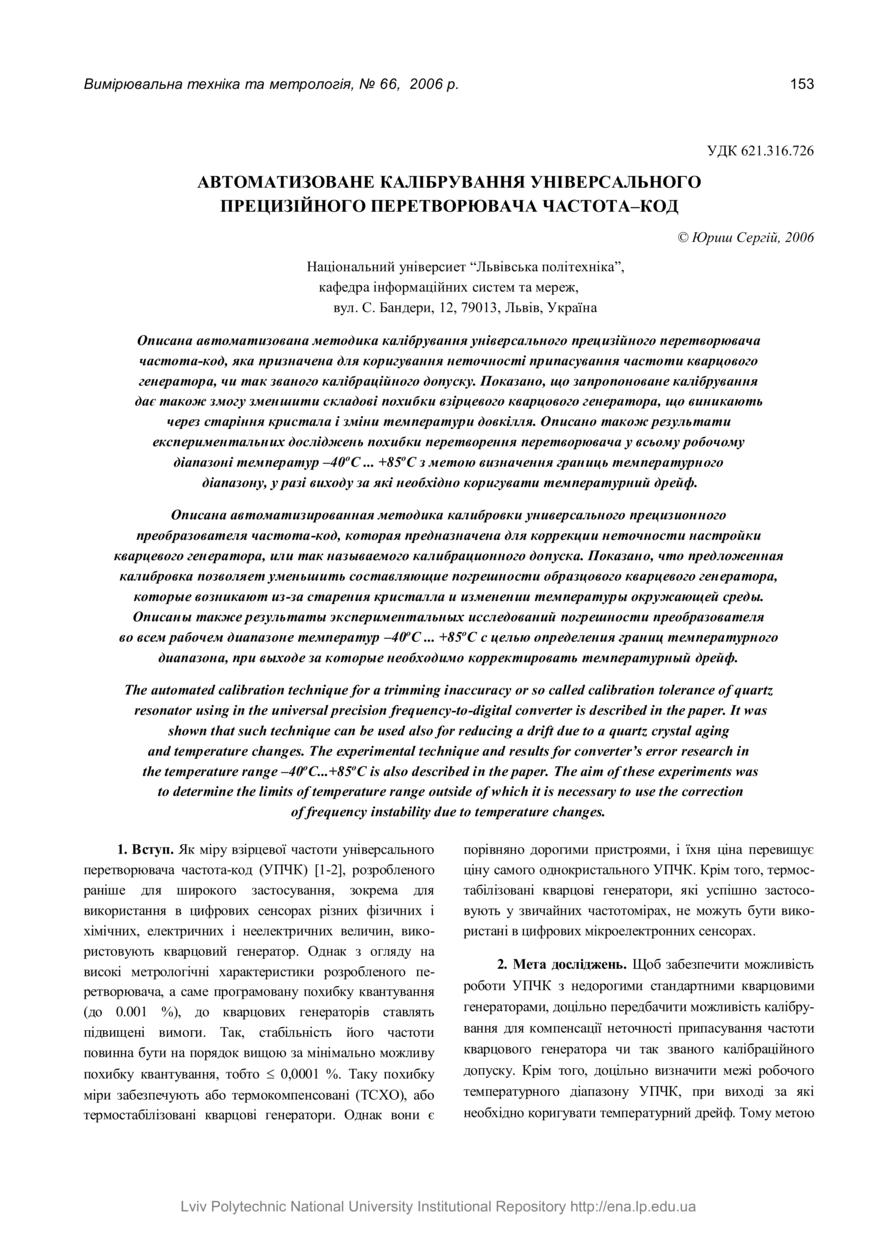 Юриш С. Автоматизоване калібрування універсального прецизійного перетворювача частота–код / Сергій Юриш // Вимірювальна техніка та метрологія. — Львів : Видавництво Національного університету “Львівська політехніка”, 2006. — № 66. — С. 153–161.