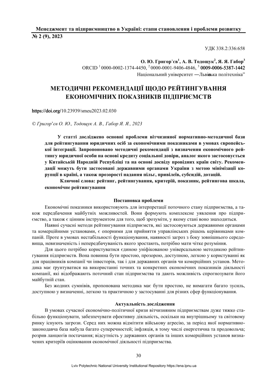 Григор’єв О. Ю. Методичні рекомендації щодо рейтингування економічних показників підприємств / О. Ю. Григор’єв, А. В. Тодощук, Я. Я. Габор // Менеджмент та підприємництво в Україні: етапи становлення і проблеми розвитку. — Львів : Видавництво Львівської політехніки, 2023. — Том 5. — № 2. — С. 30–37.