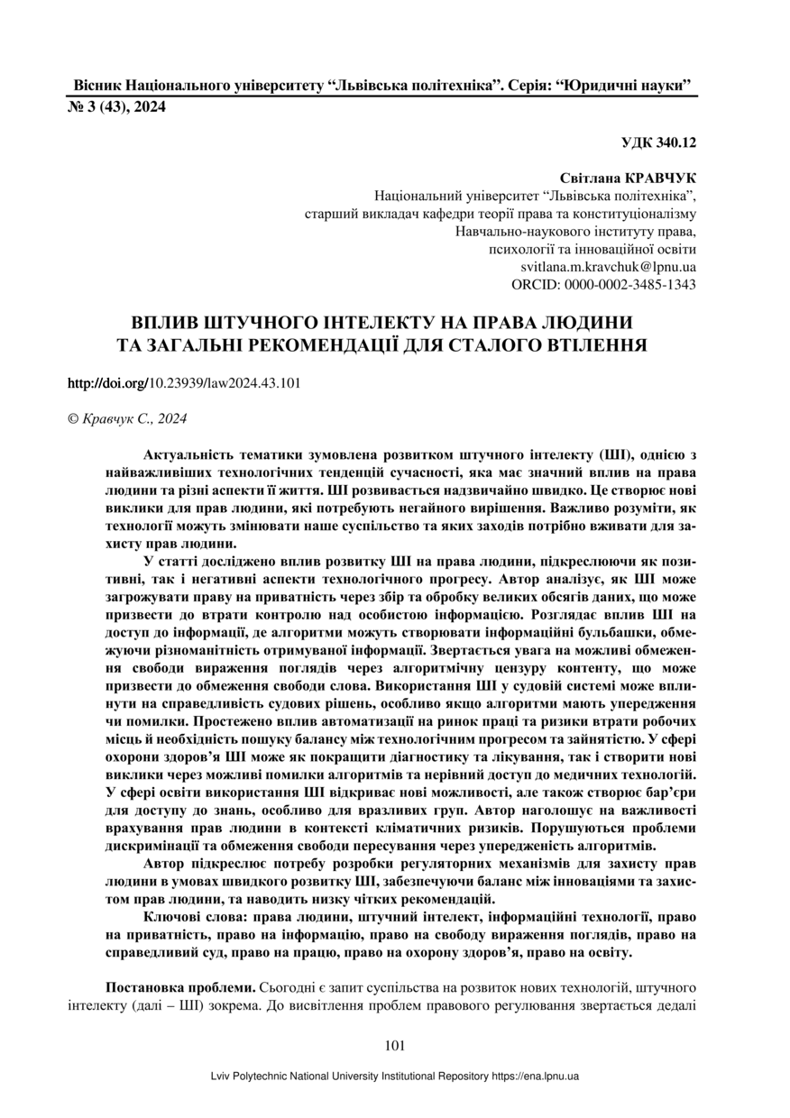 Кравчук С. Вплив штучного інтелекту на права людини та загальні рекомендації для сталого втілення / Світлана Кравчук // Вісник Національного університету “Львівська політехніка”. Серія: “Юридичні науки”. — Львів : Видавництво Львівської політехніки, 2024. — № 3(43). — С. 101–110.