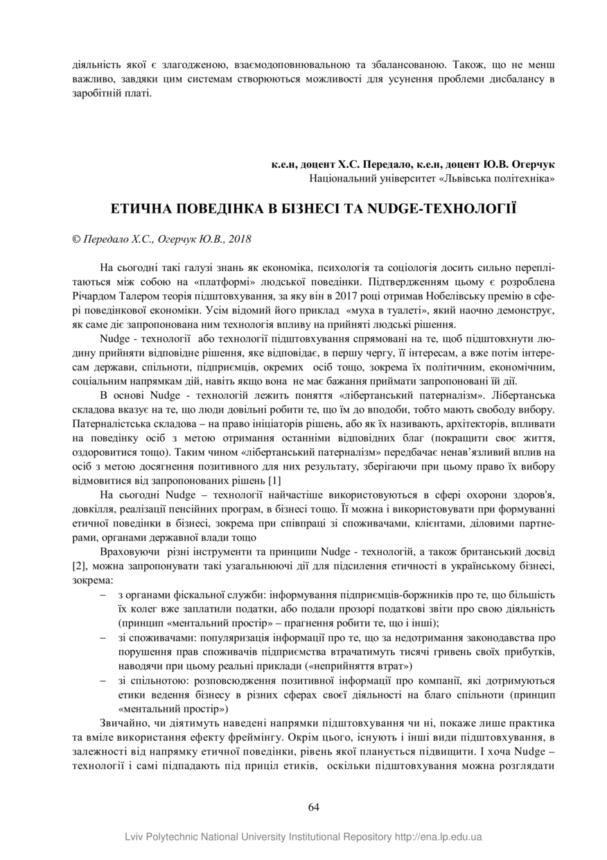 Передало Х. С. Етична поведінка в бізнесі та Nudge-технології / Х. С. Передало, Ю. В. Огерчук // Проблеми економіки, фінансів та управління експортно-імпортною діяльністю : матеріали ІІІ Міжнародної науково-практичної інтернет-конференції, 16 травня 2018 року