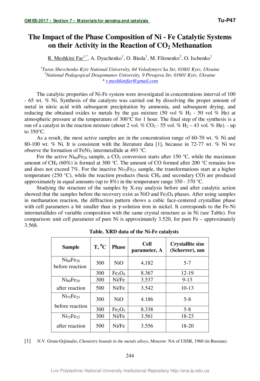 | dc.identifier.citation | The Impact of the Phase Composition of Ni - Fe Catalytic Systems on their Activity in the Reaction of CO2 Methanation / R. Meshkini Far, A. Dyachenko, O. Bieda, M. Filonenko, O. Ischenko // Oxide Materials for Electronic Engineering – fabrication, properties and applications : book of abstracts international conference, May 29–June 2, 2017 Lviv, Ukraine. — Lviv, 2017. — P. 244. — (7 materials for sensing and catalysis). | |