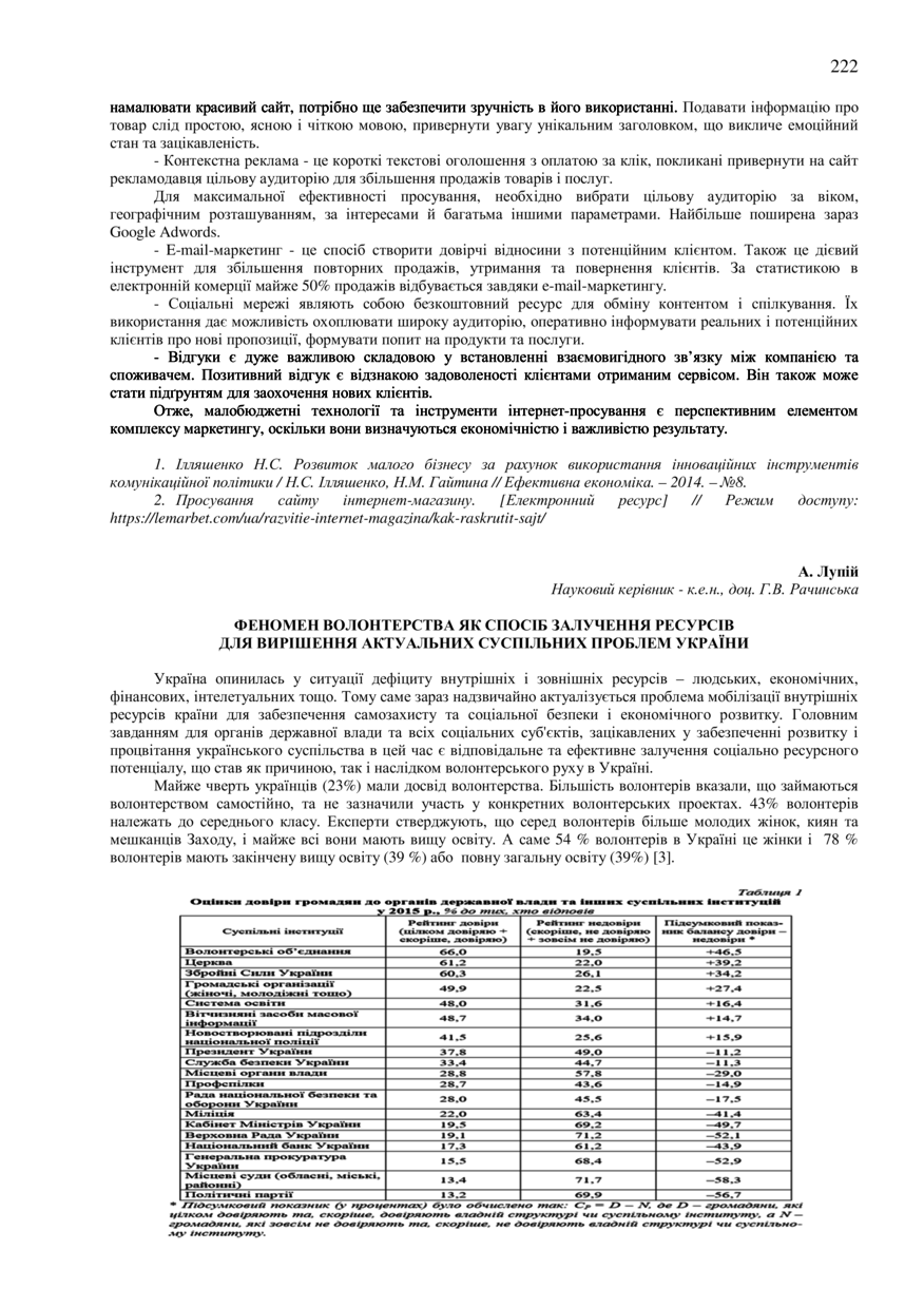 Лупій А. Феномен волонтерства як спосіб залучення ресурсів для вирішення актуальних суспільних проблем України / А. Лупій, Г. В. Рачинська // 76-та Студентська науково-технічна конференція. Секція "Економіка і менеджмент" : збірник тез доповідей, жовтень – листопад 2018 року. — Львів : Видавництво Львівської політехніки, 2018. — С. 222–223. — (Управління малим і середнім бізнесом).