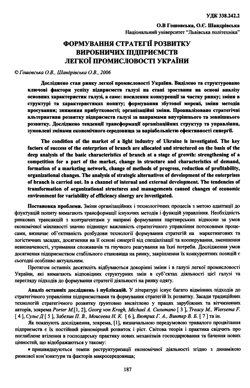 В Гошовська О. Формування стратегії розвитку виробничих підприємств легкої промисловості України / О. В Гошовська, О. Є. Шандрівська // Вісник Національного університету “Львівська політехніка”. — Львів : Видавництво Національного університету “Львівська політехніка”, 2006. — № 552 : Логістика. — С. 187–195. — (Логістичне та маркетингове управління).