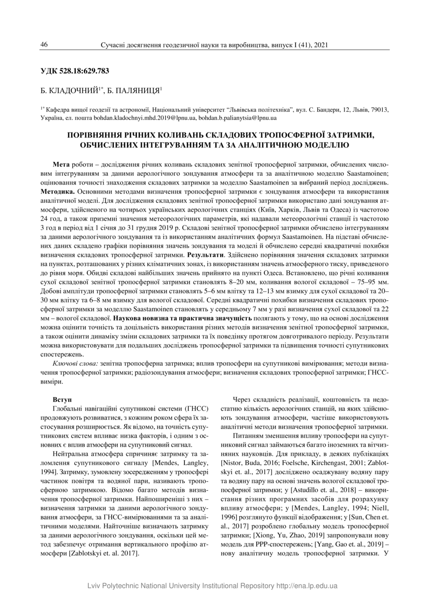 Кладочний Б. Порівняння річних коливань складових тропосферної затримки, обчислених інтегруванням та за аналітичною моделлю / Б. Кладочний, Б. Паляниця // Сучасні досягнення геодезичної науки та виробництва. — Львів : Видавництво Львівської політехніки, 2021. — Том 1(41). — С. 46–54.