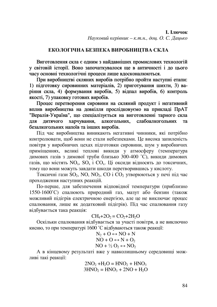 Ілючок І. Екологічна безпека виробництва скла / І. Ілючок, О. С. Дацько // 77-ма Студентська науково-технічна конференція : збірник тез доповідей, жовтень, Львів. — Львів : Видавництво Львівської політехніки, 2019. — С. 84–85. — (Секція екології, природоохоронної діяльності і туризму).
