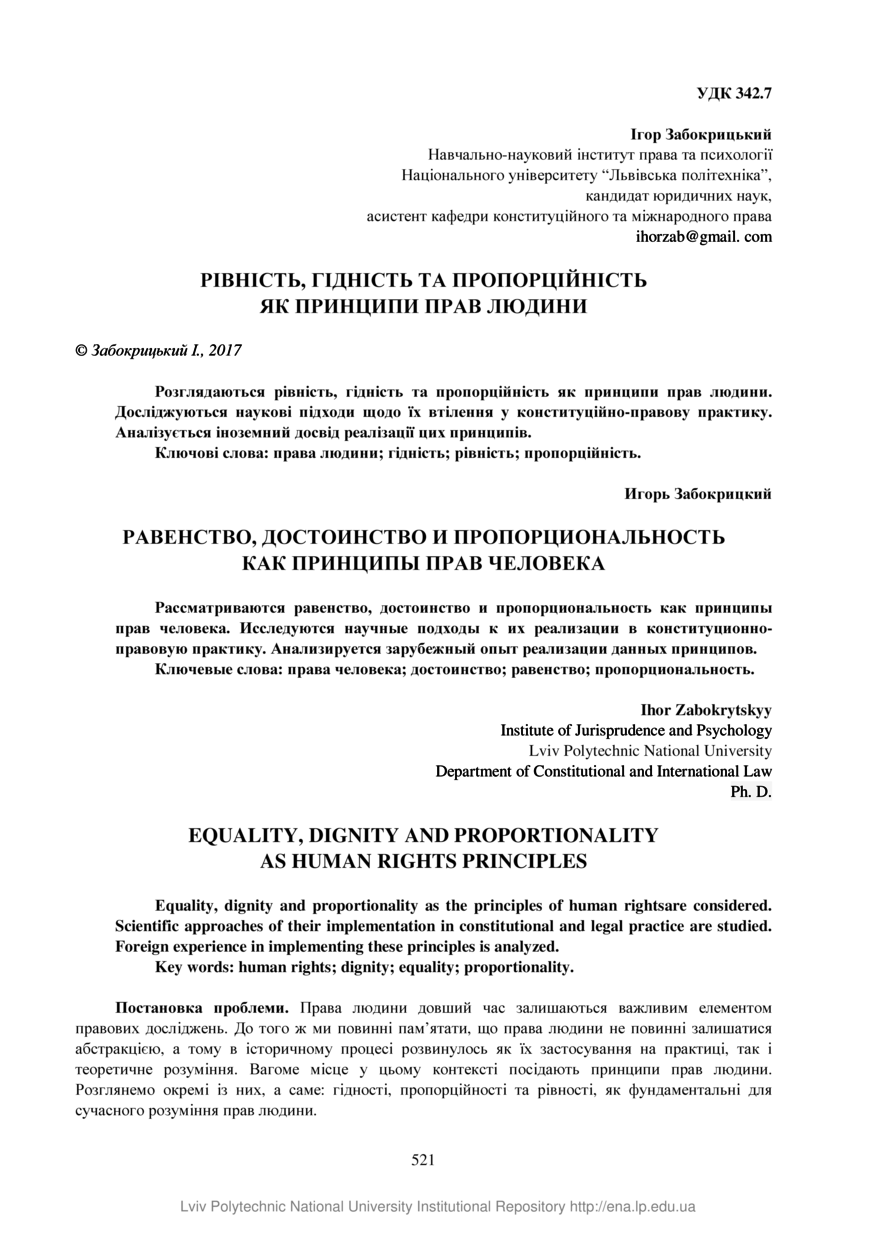 Забокрицький І. Рівність, гідність та пропорційність як принципи прав людини / Ігор Забокрицький // Вісник Національного університету «Львівська політехніка». Серія: юридичні науки : збірник наукових праць. — Львів : Видавництво Львівської політехніки, 2017. — № 865. — С. 521–530.