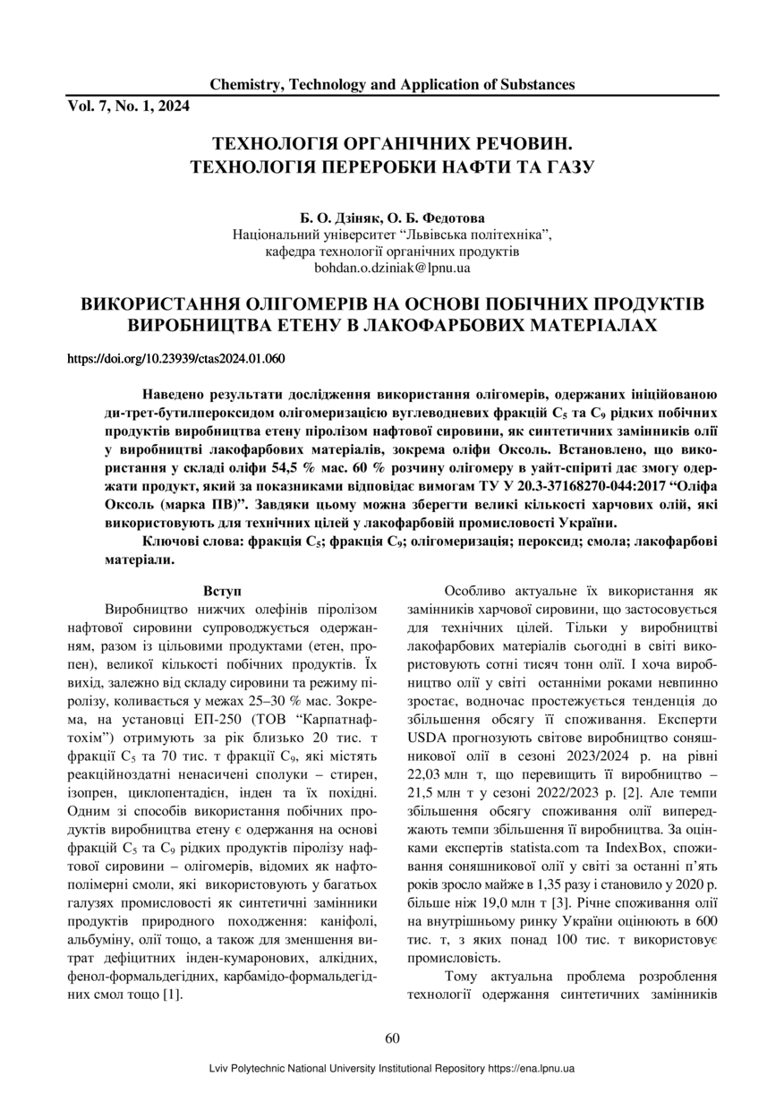 Дзіняк Б. О. Використання олігомерів на основі побічних продуктів виробництва етену у лакофарбових матеріалах / Б. О. Дзіняк, О. Б. Федотова // Хімія, технологія речовин та їх застосування. — Львів : Видавництво Львівської політехніки, 2024. — Том 1. — № 7. — С. 60–65.