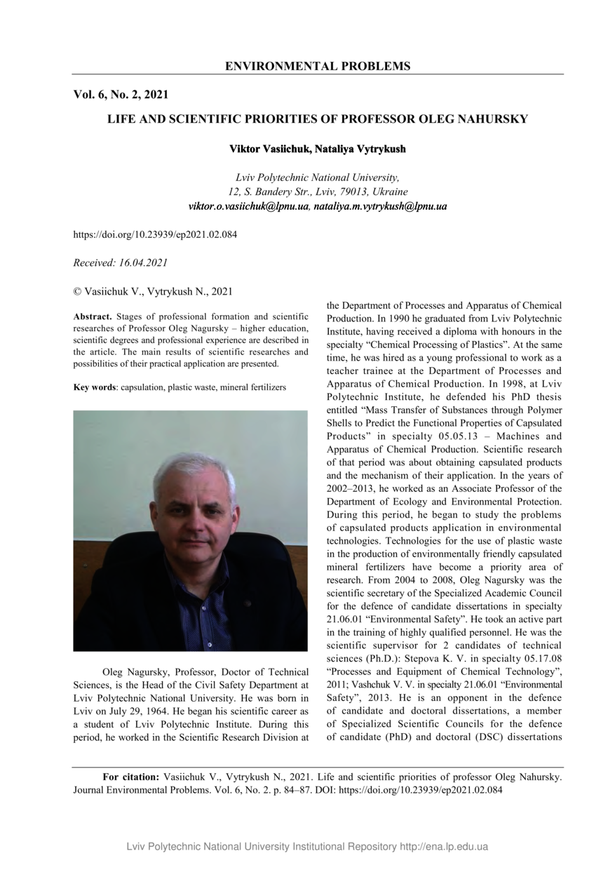 | dc.identifier.citation | Vasiichuk V. Life and scientific priorities of professor Oleg Nahursky / Viktor Vasiichuk, Nataliya Vytrykush // Environmental Problems. — Lviv : Lviv Politechnic Publishing House, 2021. — Vol 6. — No 2. — P. 84–87. | |
