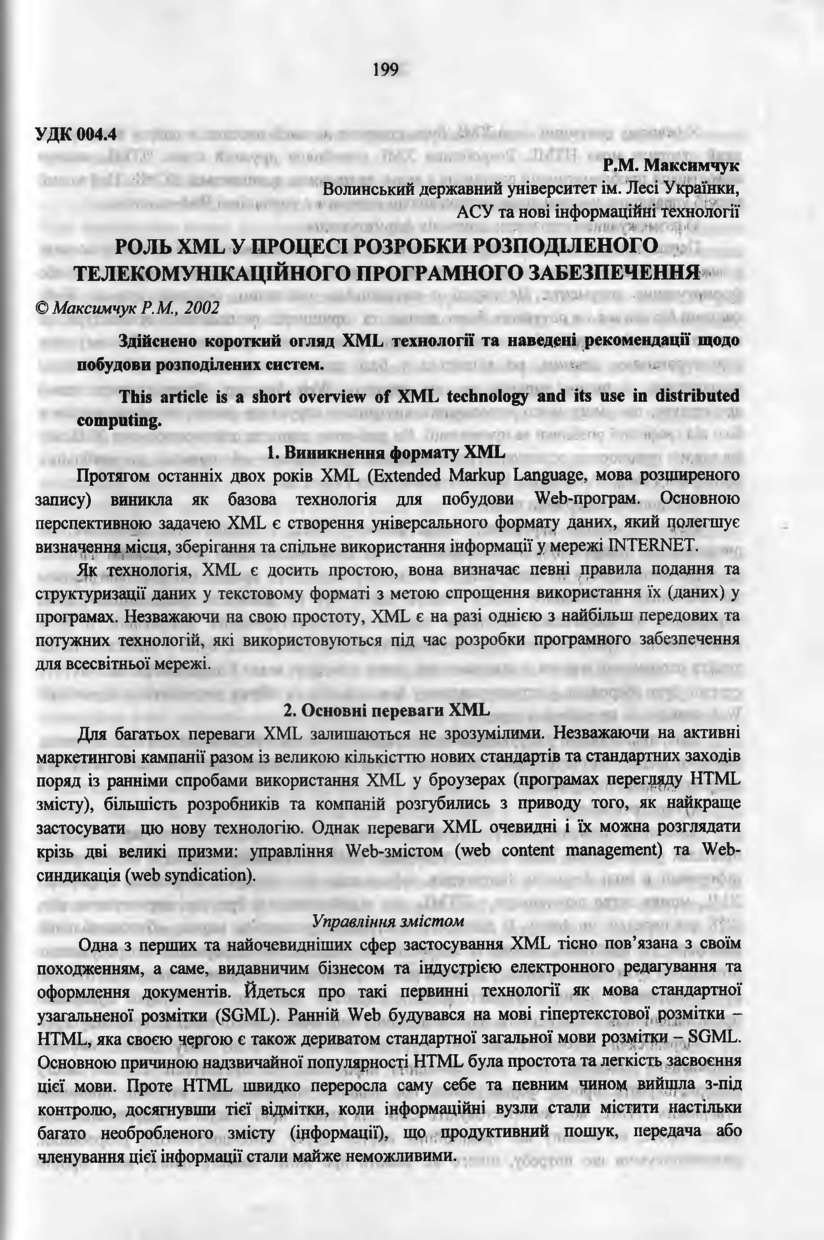 Максимчук Р. М. Роль XML у процесі розробки розподіленого телекомунікаційного програмного забезпечення / Р. М. Максимчук // Вісник Національного університету “Львівська політехніка”. — Львів : Видавництво Національного університету “Львівська політехніка”, 2002. — № 440 : Радіоелектроніка та телекомунікації. — С. 199–202.