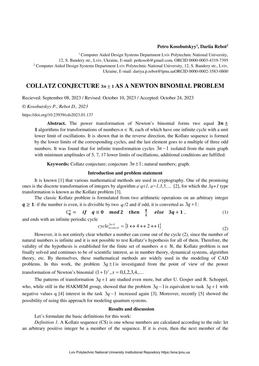 Kosobutskyy P. Collatz conjecture 3n±1 as a newton binomial problem / Petro Kosobutskyy, Dariia Rebot // Computer Design Systems. Theory and Practice. — Lviv : Lviv Politechnic Publishing House, 2023. — Vol 5. — No 1. — P. 137–144.