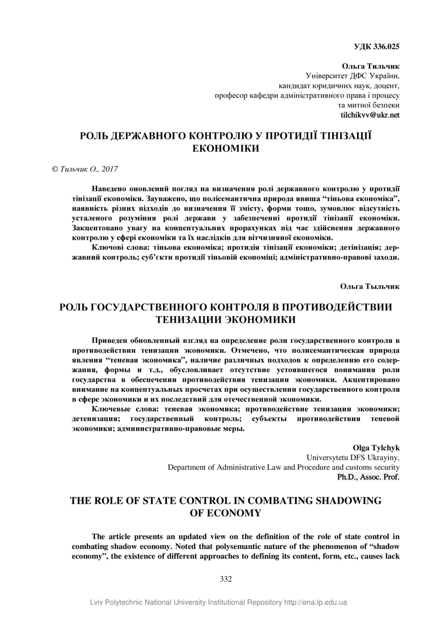 | dc.identifier.citation | Тильчик О. Роль державного контролю у протидії тінізації економіки / Ольга Тильчик // Вісник Національного університету «Львівська політехніка». Серія: юридичні науки : збірник наукових праць. — Львів : Видавництво Львівської політехніки, 2017. — № 865. — С. 332–337. | |