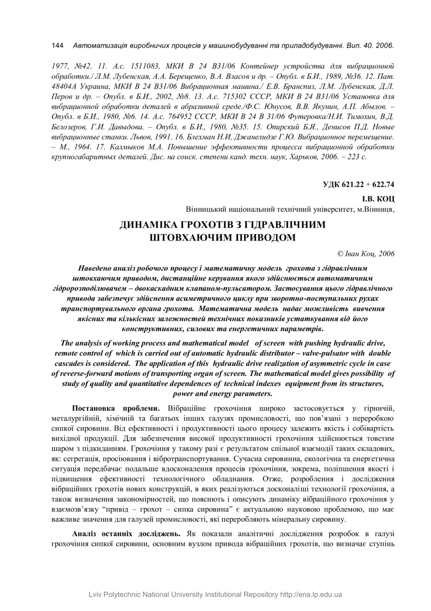 | dc.title | Динаміка грохотів з гідравлічним штовхаючим приводом | |