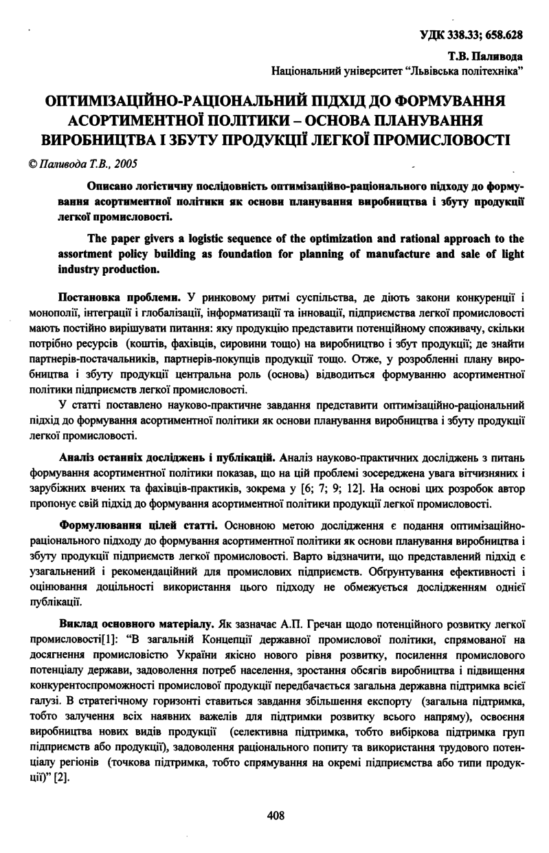 Паливода Т. В. Оптимізаційно-раціональний підхід до формування асортиментної політики - основа планування виробництва і збуту продукції легкої промисловості / Т. В. Паливода // Вісник Національного університету “Львівська політехніка”. — Львів : Видавництво Національного університету “Львівська політехніка”, 2005. — № 526 : Логістика. — С. 408–412. — (Логістичне та маркетингове управління).