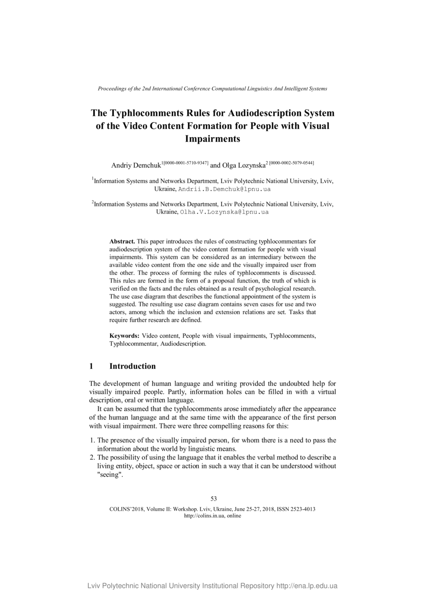 Demchuk A. The Typhlocomments Rules for Audiodescription System of the Video Content Formation for People with Visual Impairments / Andriy Demchuk, Olga Lozynska // Computational linguistics and intelligent systems, 25-27 June 2018. — Lviv : Lviv Polytechnic National University, 2018. — Vol 2 : Workshop. — P. 53–59. — (Part 1. Keynote speakers talks).