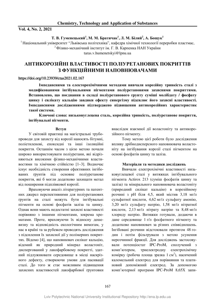 Антикорозійні властивості поліуретанових покриттів з функційними наповнювачами / Т. В. Гуменецький, М. М. Братичак, Л. М. Білий, А. Бощук // Chemistry, Technology and Application of Substances. — Lviv : Lviv Politechnic Publishing House, 2021. — Том 4. — № 2. — С. 167–172.