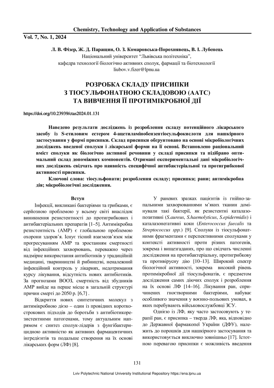 | dc.identifier.citation | Розробка складу присипки з тіосульфонатною складовою (ААТС) та вивчення її протимікробної дії / Л. В. Фізер, Ж. Д. Паращин, О. З. Комаровська-Порохнявець, В. І. Лубенець // Хімія, технологія речовин та їх застосування. — Львів : Видавництво Львівської політехніки, 2024. — Том 1. — № 7. — С. 131–139. | |