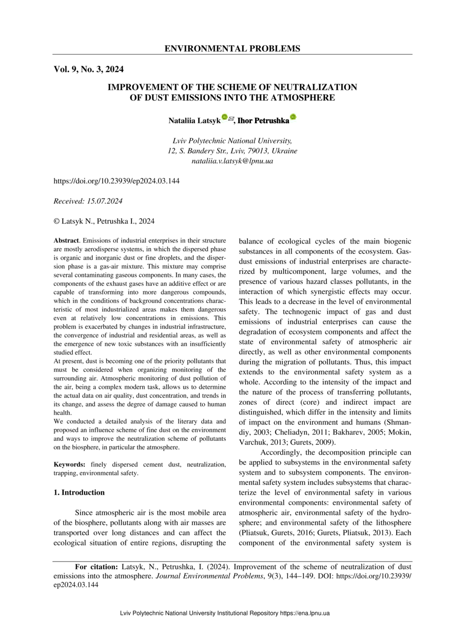Latsyk N. Improvement of the scheme of neutralization of dust emissions into the atmosphere / Nataliia Latsyk, Ihor Petrushka // Environmental Problems. — Lviv : Lviv Politechnic Publishing House, 2024. — Vol 9. — No 3. — P. 144–149.