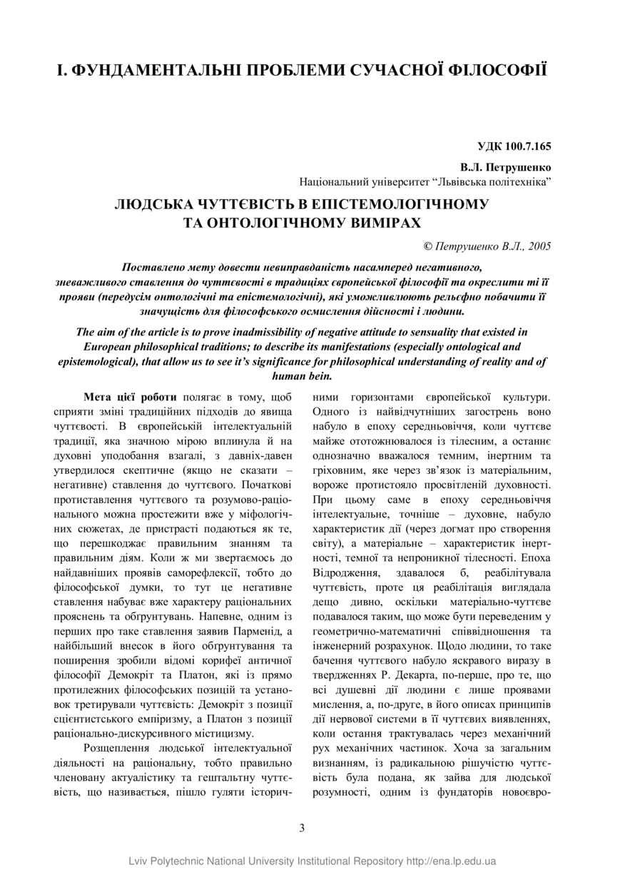 Петрушенко В. Л. Людська чуттєвість в епістемологічному та онтологічному вимірах / В. Л. Петрушенко // Вісник Національного університету “Львівська політехніка”. — Львів : Видавництво Національного університету “Львівська політехніка”, 2005. — № 525 : Філософські науки. — С. 3–8. — (Фундаментальні проблеми сучасної філософії).