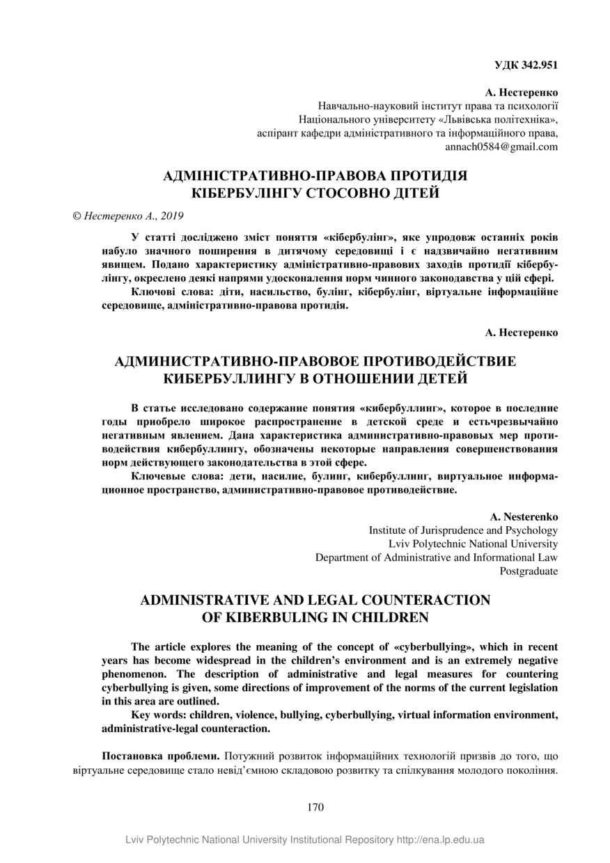 Нестеренко А. Адміністративно-правова протидія кібербулінгу стосовно дітей / А. Нестеренко // Вісник Національного університету “Львівська політехніка”. Серія: Юридичні науки. — Львів : Видавництво Львівської політехніки, 2019. — № Випуск 21. — С. 170–175.