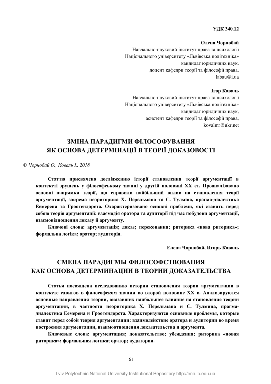 Чорнобай О. Зміна парадигми філософування як основа детермінації в теорії доказовості / Олена Чорнобай, Ігор Коваль // Вісник Національного університету “Львівська політехніка”. Серія: Юридичні науки. — Львів : Видавництво Львівської політехніки, 2018. — № 902 (19). — С. 61–67.