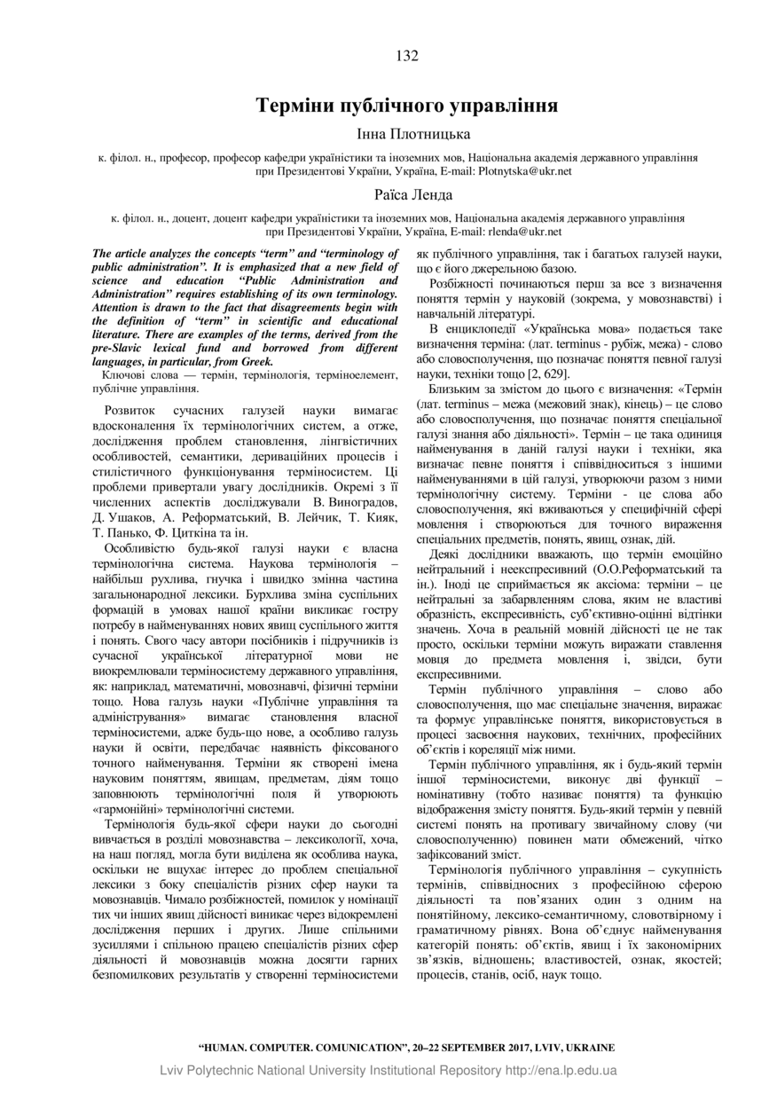 Плотницька І. Терміни публічного управління / Інна Плотницька, Раїса Ленда // Людина. Комп’ютер. Комунікація : збірник наукових праць. — Львів : Видавництво Львівської політехніки, 2017. — С. 132–133. — (6. Термінознавство).