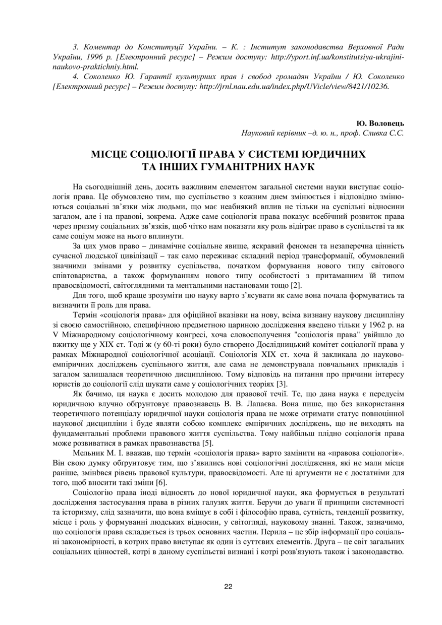 Воловець Ю. Місце соціології права у системі юрдичних та інших гуманітрних наук / Ю. Воловець, С. С. Сливка // 76-та Студентська науково-технічна конференція. Секція права та психології : збірник тез доповідей, 15–29 жовтня 2018 року, Львів. — Львів : Видавництво Львівської політехніки, 2018. — С. 22–23. — (Теорії та філософії права).
