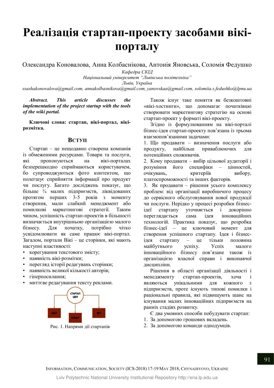 Реалізація стартап-проекту засобами вікі-порталу / Олександра Коновалова, Анна Колбаснікова, Антонія Яновська, Соломія Федушко // Інформація, комунікація, суспільство : матеріали 7-ї Міжнародної наукової конференції, 17–19 травня 2018 року, Чинадієво. — Львів : Видавництво Львівської політехніки, 2018. — С. 91–92. — (Інформаційні та комунікаційні технології в Internet та World Wide Web).
