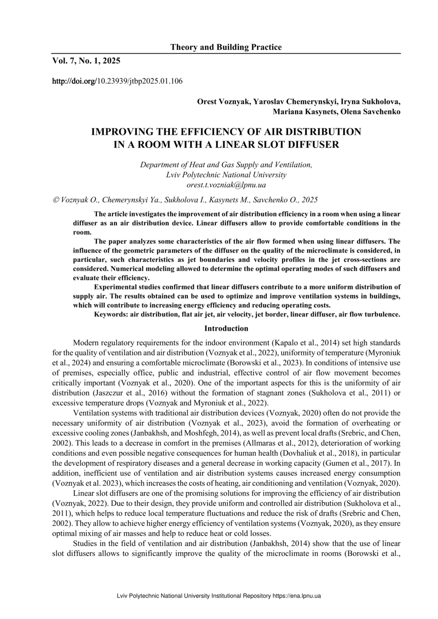 Improving the efficiency of air distribution in a room with a linear slot diffuser / Orest Voznyak, Yaroslav Chemerynskyi, Iryna Sukholova, Mariana Kasynets, Olena Savchenko // Theory and Building Practice. — Lviv : Lviv Politechnic Publishing House, 2025. — Vol 7. — No 1. — P. 106–111.